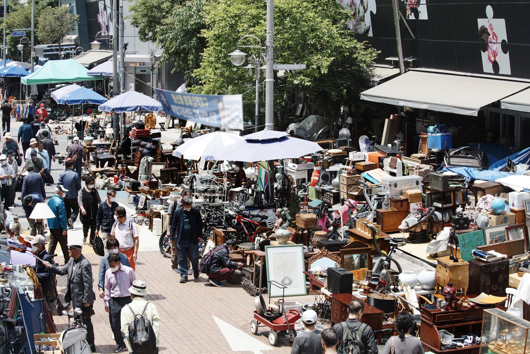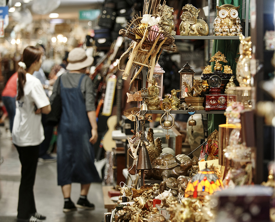 因攤販商就像跳蚤般輾轉韓國八道尋找古老珍奇物品,使得聚集在黃鶴洞的攤販被稱為跳蚤市場,他們隨著近現代化的演進,搬遷至的新設洞新據點即是首爾風物市場。就像呼應「應有盡有」這個形容詞般,從一看就知道是首爾風物市場入口的標示牌下方開始便是人潮洶湧。櫛比鱗次的攤販上從菸袋到舊款相機,無奇不有。