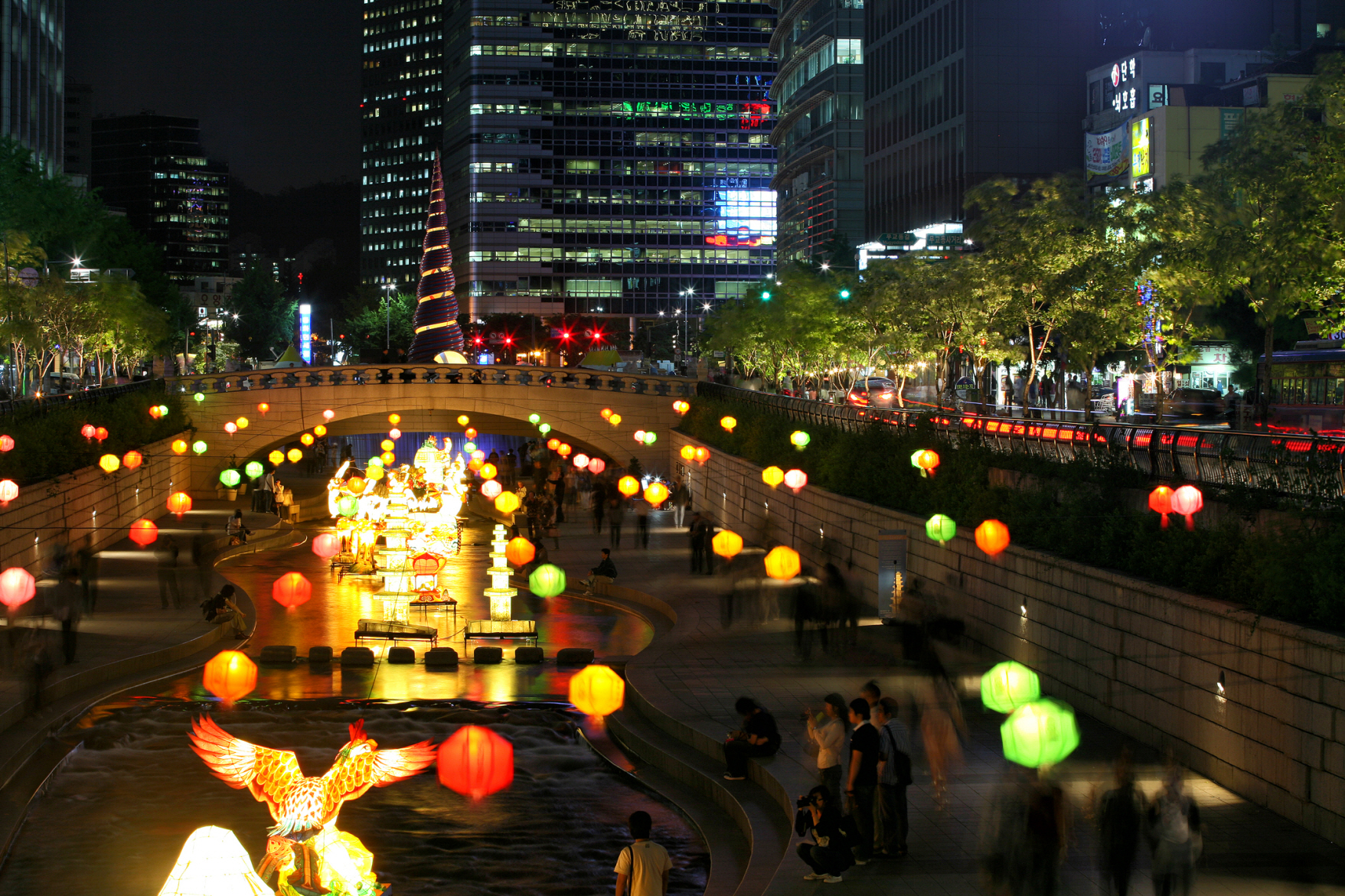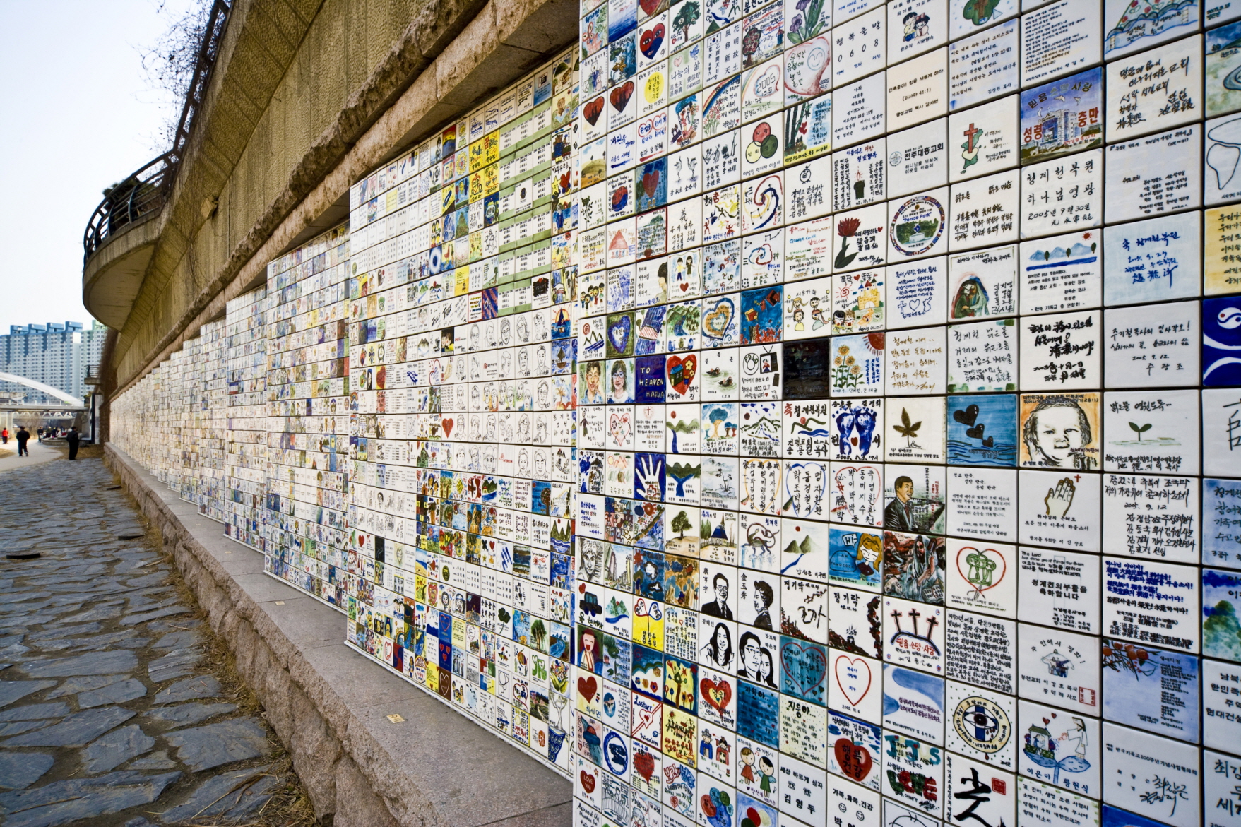 從地鐵往首爾風物市場的方向繼續往前走,就能抵達清溪川。若看到為了紀念復原清溪川,用2萬多名市民的手寫願望磁磚佈置而成的「許願牆」,那就走對了。往右走可穿越鐘路直達清溪川廣場,沿途參觀多樣景觀;往左走時,路段雖然不長,但同樣能參觀二水橋、求婚牆、木板房主題區等充實的趣味看點。夜景也不遑多讓,若有機會經過附近,不妨悠閒地漫步約三四個公車站的距離。