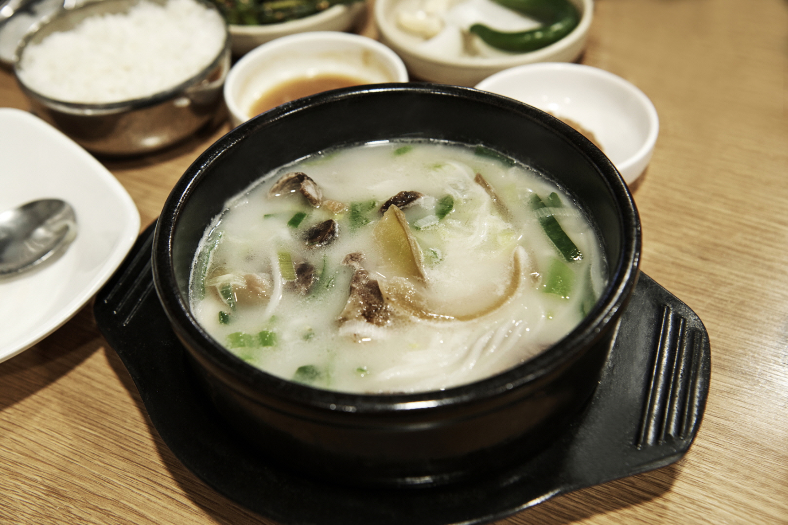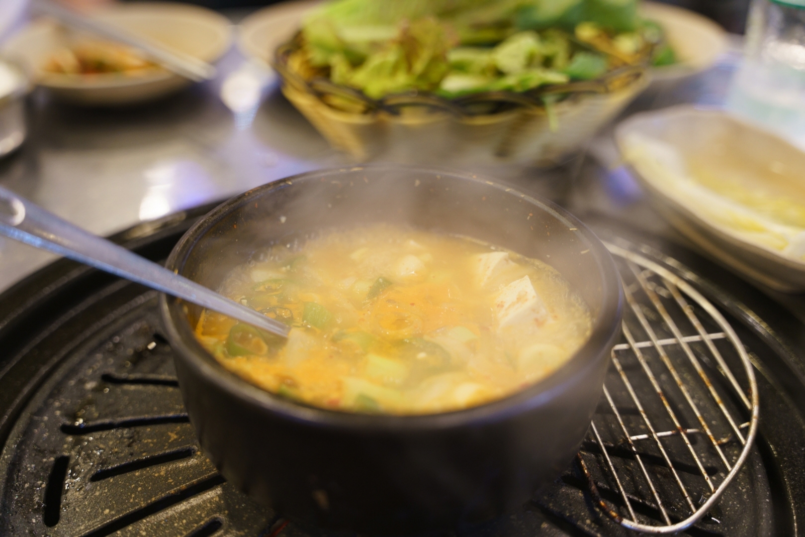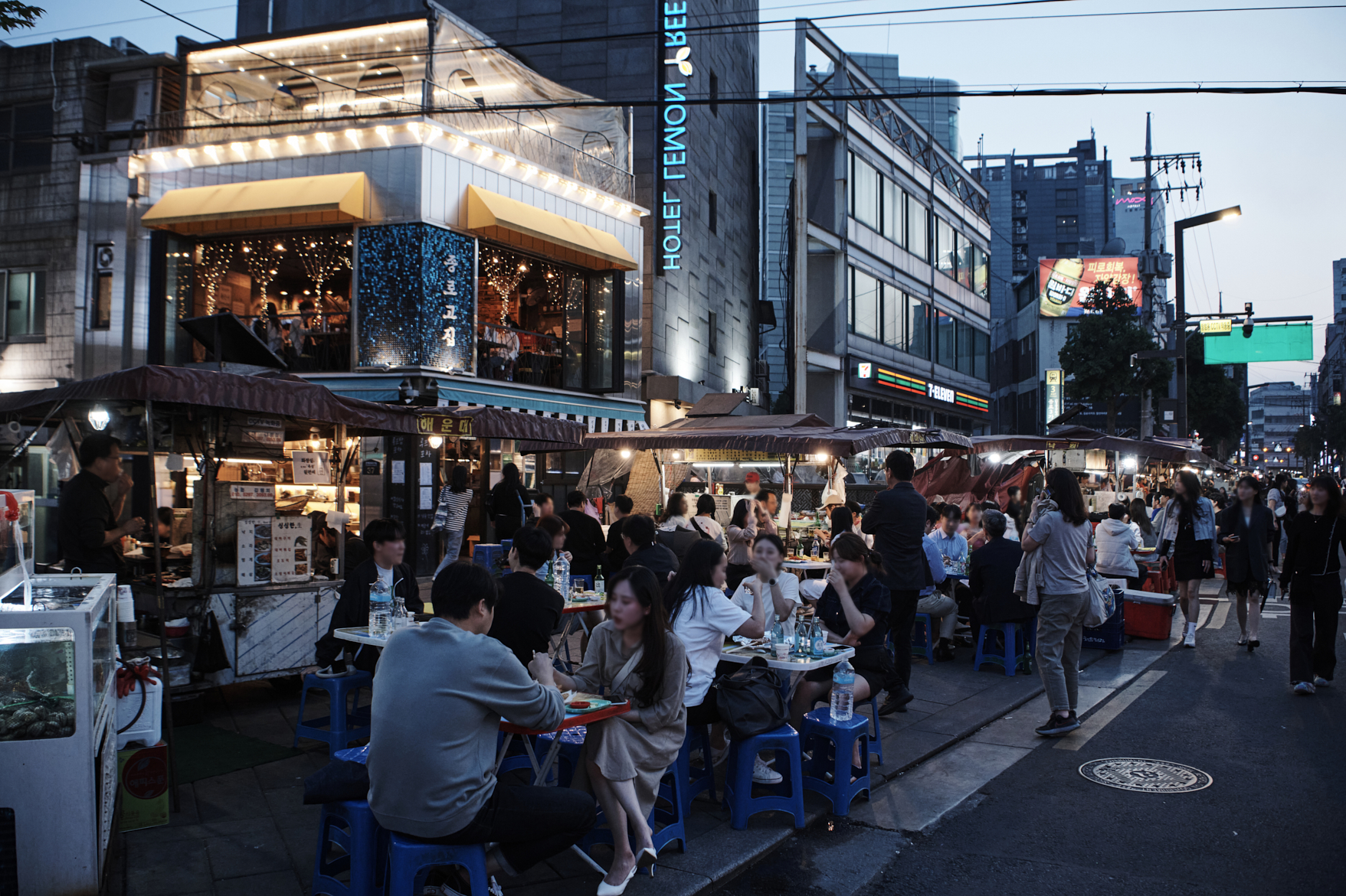 咕嘟咕嘟地從砂鍋裡溢出的辛奇鍋、大醬鍋、嫩豆腐鍋是韓國人的靈魂食物,搭配一碗剛炊煮好的熱米飯與美味小菜,就是再好不過的一餐。在紅色區2樓內側的家常套餐店可以5000~6000韓元的實惠假格享受這份幸福。