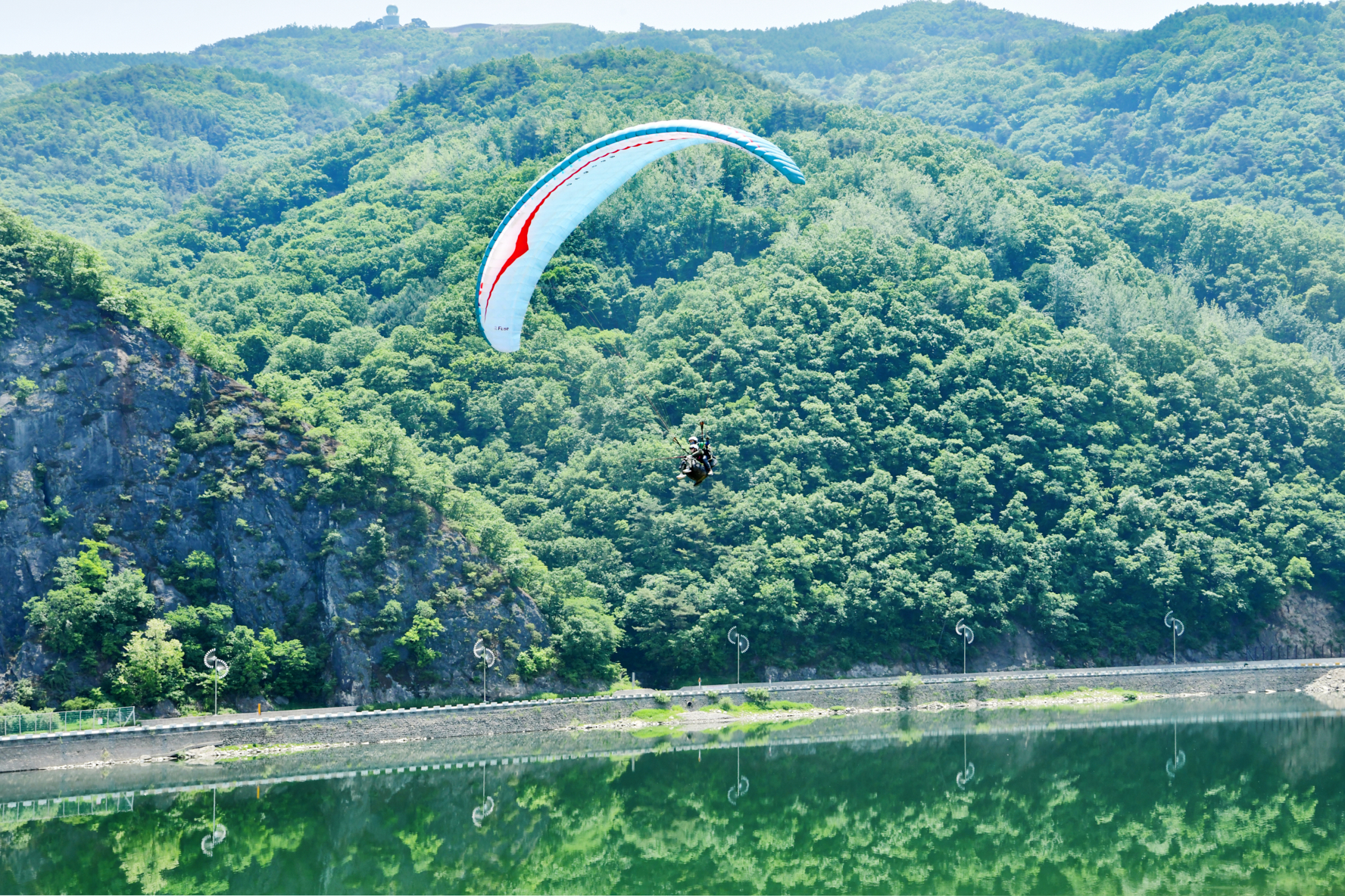 丹陽的陽坊山為全韓國首屈一指的飛行傘滑翔場,原因在於其他地區每年平均飛行日子僅有70天,但陽坊山卻因不常下雨,也少有劇烈的天候變化,可飛行的日子多達300天。設有兩處著陸場,無論風向如何都能安全著陸亦是一大優點。雖然從起飛到著陸只有短短10分鐘,但能從空中俯瞰南漢江、月岳山與錦繡山的秀麗風光,在飛行途中拍攝的高畫質照片與影片也將永久保存當下的感動。