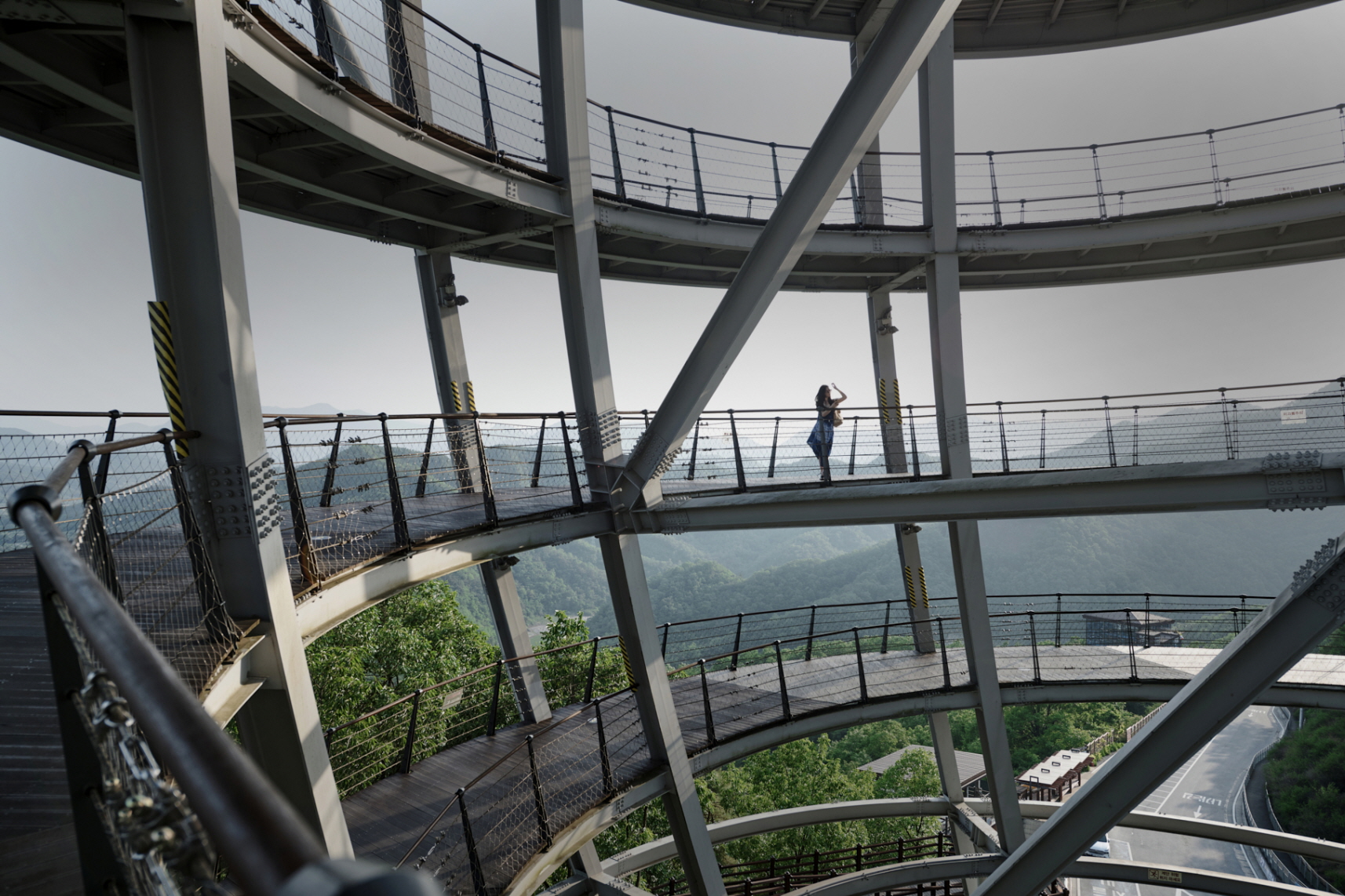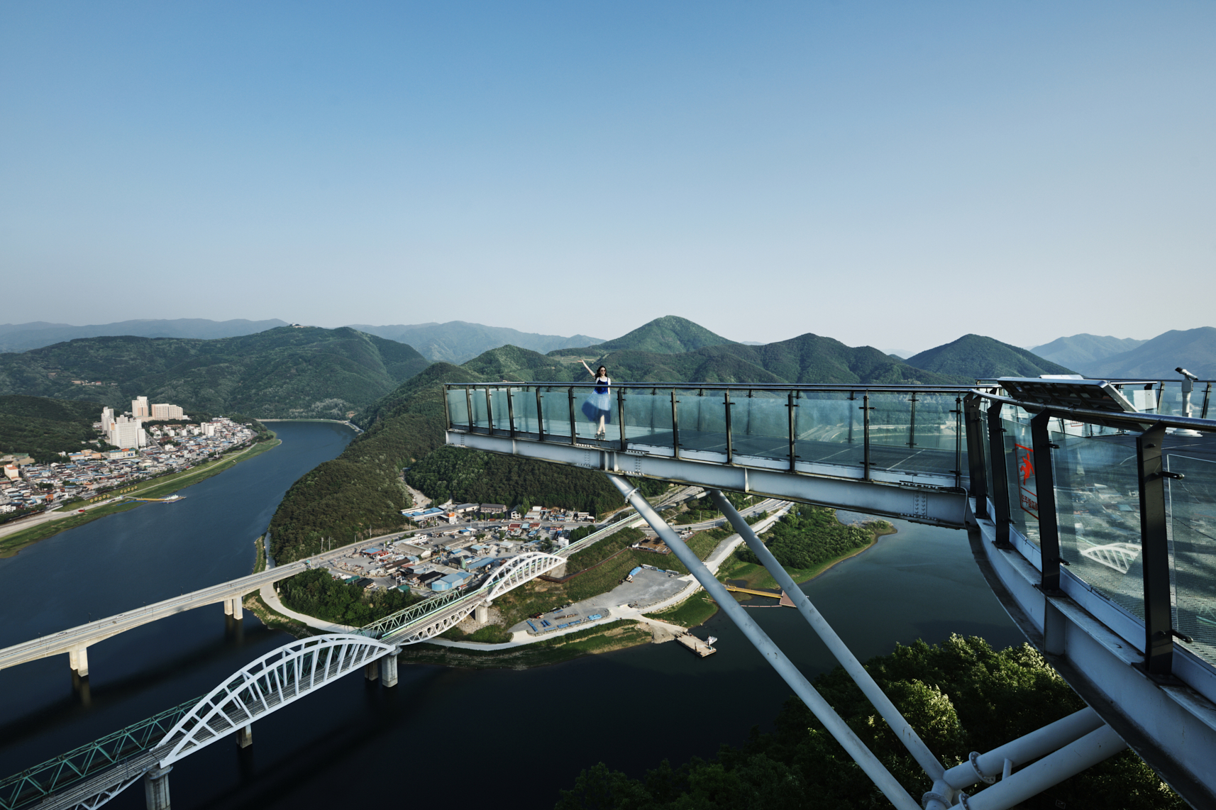 雙腳下為南漢江,前方可見丹陽市區全景。滿天下天空步道顧名思義,便是要人體會坐擁天下江山的感受。馬蹄形的萬壑千峰觀景臺位於南漢江水面上方80~90公尺處,高25公尺,滿天下天空步道即位於這裡,為長15公尺、寬2公尺的高強度三重玻璃步道,走在上頭猶如站在懸崖邊,全身充滿戰慄刺激感。另有以時速50公里如飛鳥般滑降的高空滑索、高速穿越林間的高山滑車、韓國最長的滑道、可輕鬆登上觀景臺入口的單軌列車等無窮無盡的樂趣。