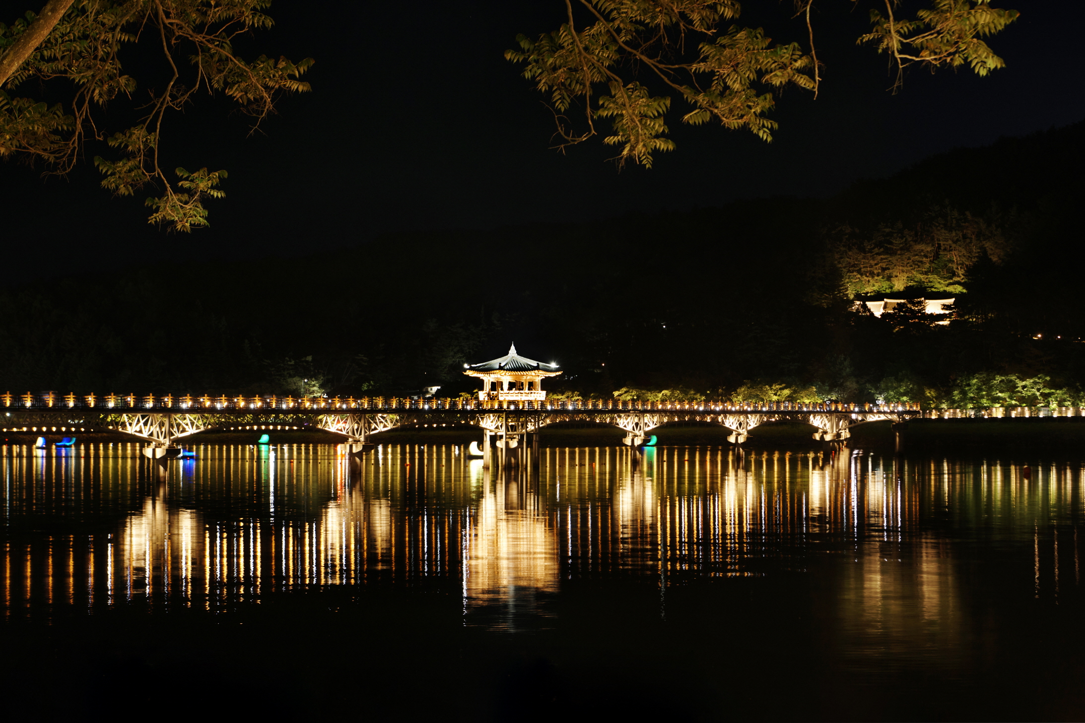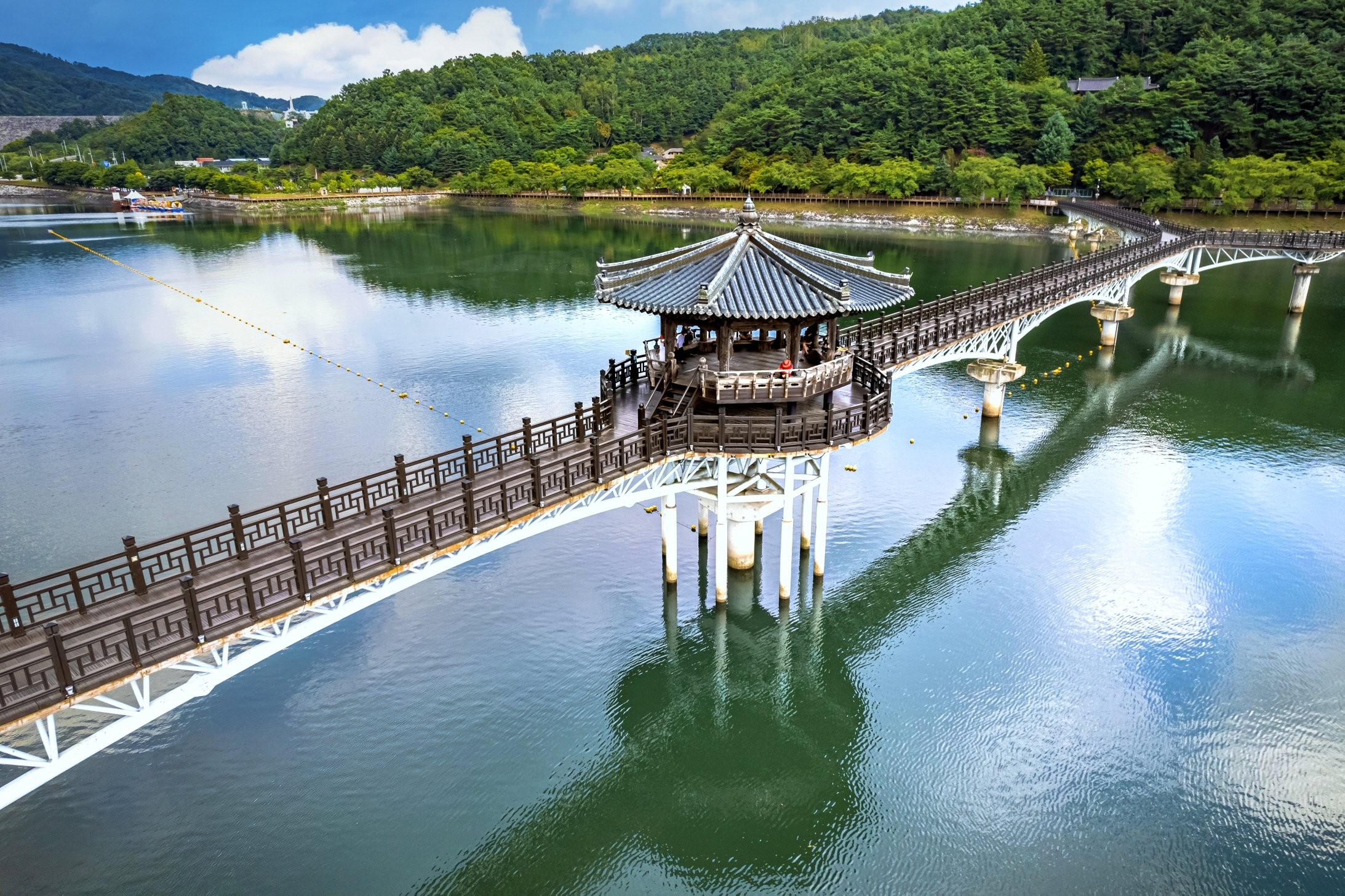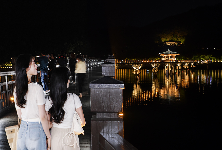 月映橋長387公尺、寬3.6公尺,為韓國最長的木柵人行橋,上橋走至中央的月映亭,便能一覽洛東江的優美風光。這裡亦是著名的夜間約會景點,來到這裡也別忘了搭乘月亮船。可自行駕駛帶有新月造型物的小船繞月映橋一圈,路線雖然單純,但若與戀人聽著用藍牙喇叭播放的甜蜜音樂,便能感受超乎想像的浪漫情調。