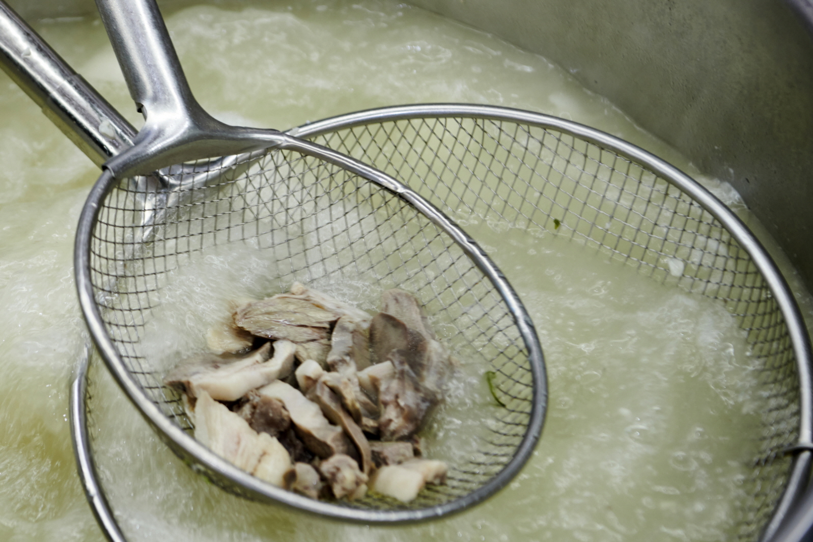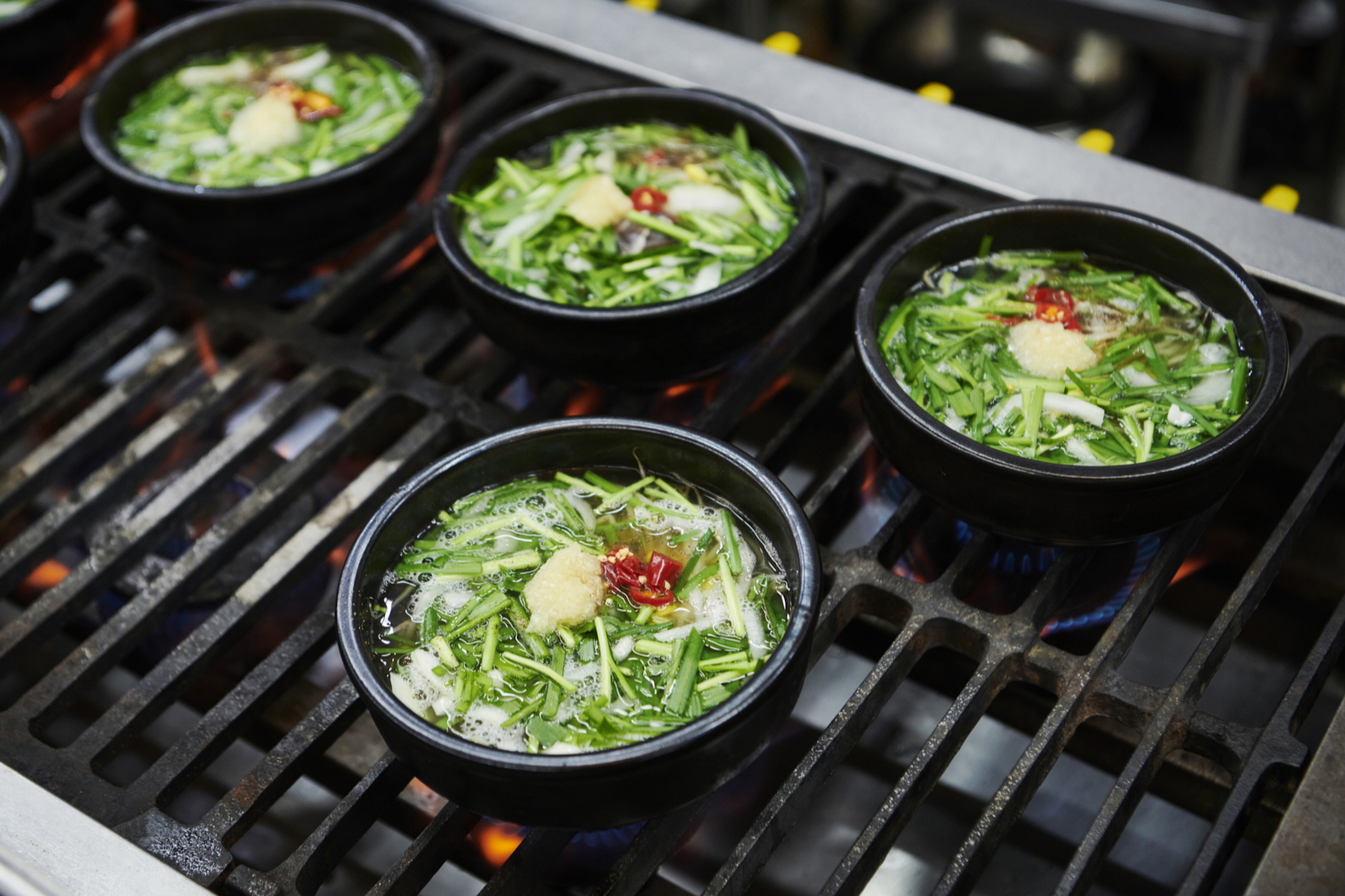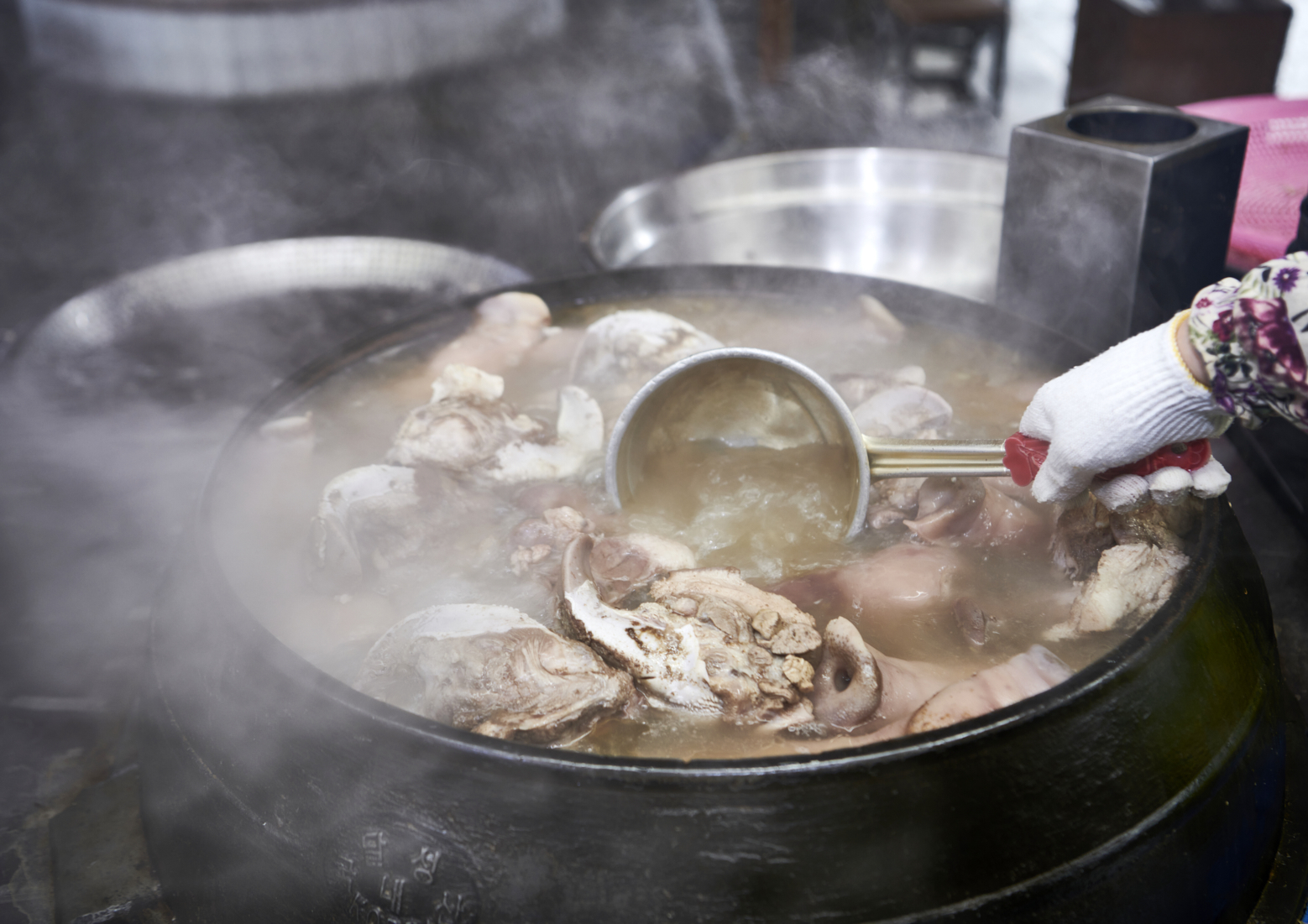 不使用小腸或內臟,而是僅用豬頭肉燉煮出淨爽高湯,加上豐盛且能徹底平衡油膩感的黃豆芽,便是深受當地人與遊客喜愛的順天上市場特產。點兩碗湯飯時,會先送上一盤加了韭菜與血腸的白切肉,令人驚訝的是,這竟然是免費招待。