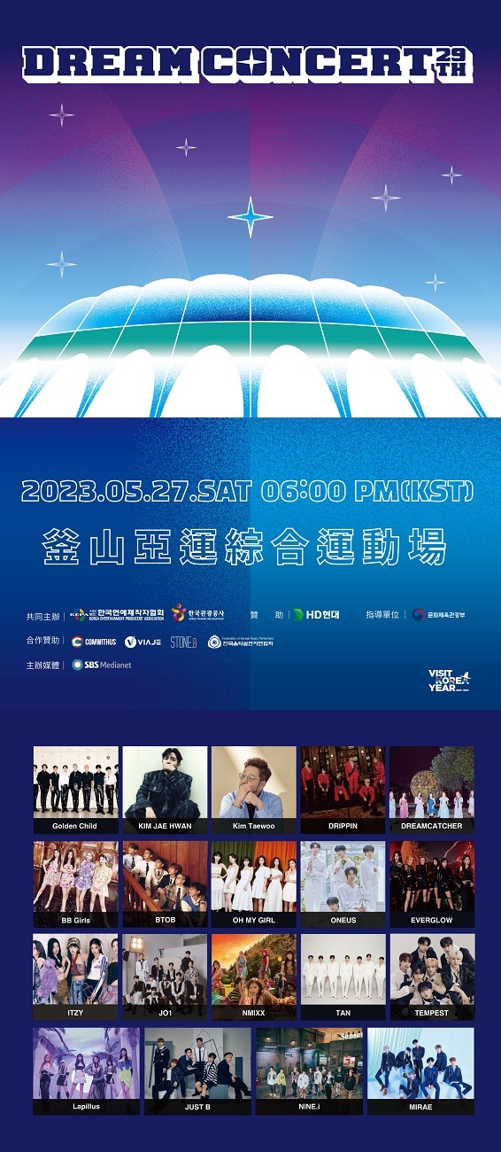 此次夢想演唱會共邀請Golden Child、金在煥、金泰宇(god)、DRIPPIN、DREAMCATCHER、BB Girls、BTOB、OH MY GIRL、ONEUS、EVERGLOW、ITZY、JO1、NMIXX、TAN、TEMPEST等韓國歌手與偶像團體參與演出,更有透過投票活動所選出的Lapillus、JUST B、NINE.i、未來少年等新人團體。今年的主持人將由韓國知名主播曹政植與OH MY GIRL的成員Yubin擔任。。而5月3日晚間8點起可以透過Ticket Link網站購買門票,每年都場場爆滿的夢想演唱會,相信今年的競爭率也相當高,想要來看夢想演唱會的話,動作也要快!如果沒有搶到門票也不用氣餒,線上表演平台「LAVATA」也將於活動當天現場轉播(日本、中國地區除外),在家裡也可以一同感受現場熱情如火的氣氛。