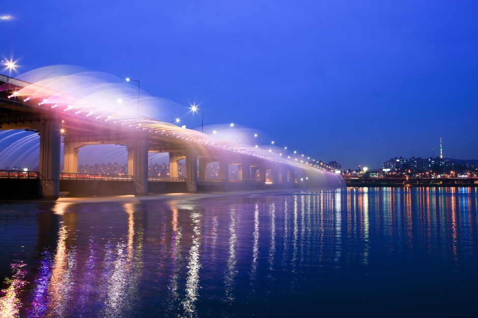 從盤浦大橋區段兩側噴向下方20公尺漢江水面的噴泉。200個五顏六色的燈光形成美麗的彩虹夜景,水柱還會配合音樂舞動。在造型山坡、漢江眺望臺和將月亮形象化的月光廣場上,可一眼看見噴泉。從4月至10月,每天表演4~6次(每次20分鐘)。