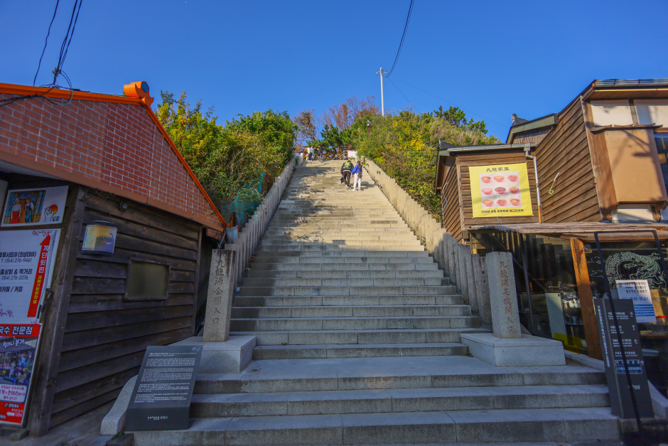 1883年朝鮮和日本簽訂《朝日通商章程》後,來到朝鮮的日本人便居住於「日本人家屋街」,而後浦項市將剩餘的幾處家屋建成「九龍浦近代文化歷史街區」。當時的餐廳「古里家」完整保存著日本家屋的內部型態,目前以茶店方式經營,在此可以品嘗到日本的各種茶以及浴衣體驗。另外,還有當時日本人就讀的尋常小學校和以1900年代樣式製作的「模型郵筒」。從公園階梯可以一眼俯瞰的漁村風景,忠實呈現出庶民的生活風貌,因此還曾榮獲大韓民國景觀大賞。